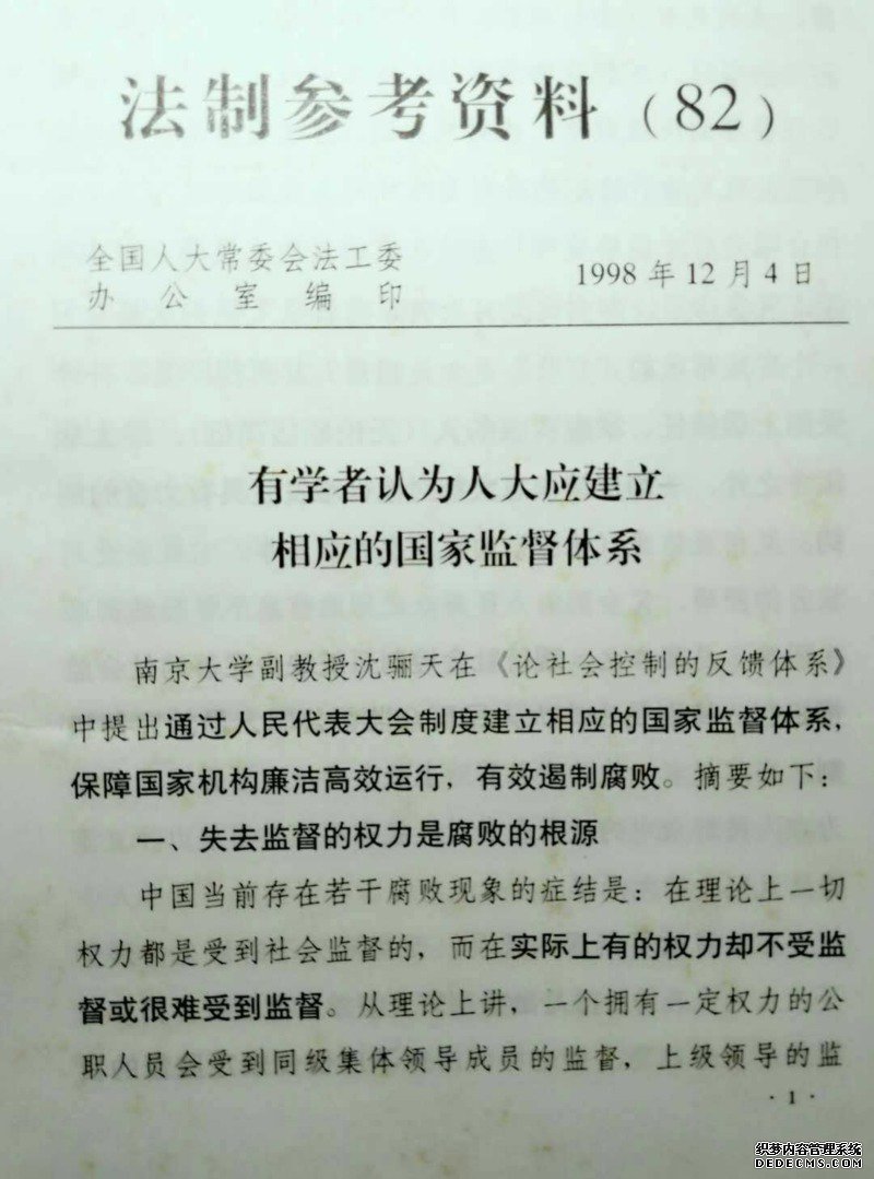 据沈骊天教授介绍,当年自己看到反腐败斗争中某些地方的“一把手”的权力不能受到有效监督的案例,结合科研课题中对社会控制反馈理论的研究,向全国人大法常委法工委提出书面建议。他建议国家设立全国人大、各级人大直接领导的国家监察机构,以加强对各级领导人权力监督的力度。这份建议当时得到全国人大常委法工委的重视,摘编为专件《法制参考资料(82)》(1998.12.4),直接报送党中央、人大常委委员长、国务院总理等党和国家机关负责人。虽然当时因为种种原因,没有很快采用这一建议,但是作为公民,能将自己的国事建言送达党和国家领导人视野,供今后国家改革参考,也从中感受到了人民参政议政的使命感和责任感。看到20年后的今天,以习近平同志为核心的党中央锐意改革,领导党和国家大刀阔斧强化国家权力监督体制,更是感到非常欣慰。沈骊天教授还表示,当年南京大学哲学系教师胡福明曾以一篇真理标准的论文,以第一点星火推出思想解放的燎原之势,今天作为国家高水平大学的学者们,有责任更多地关心国事,参政议政,用自己的知识、理论、研究成果提出切实有益于人民的建言,为圆强国梦尽自己的力量。